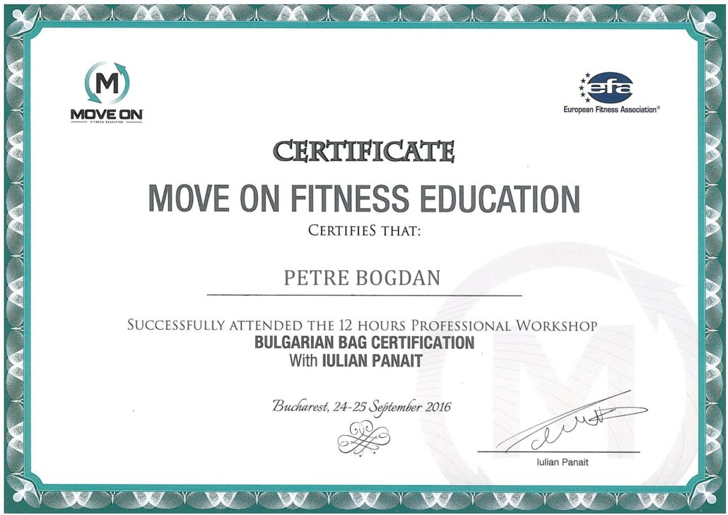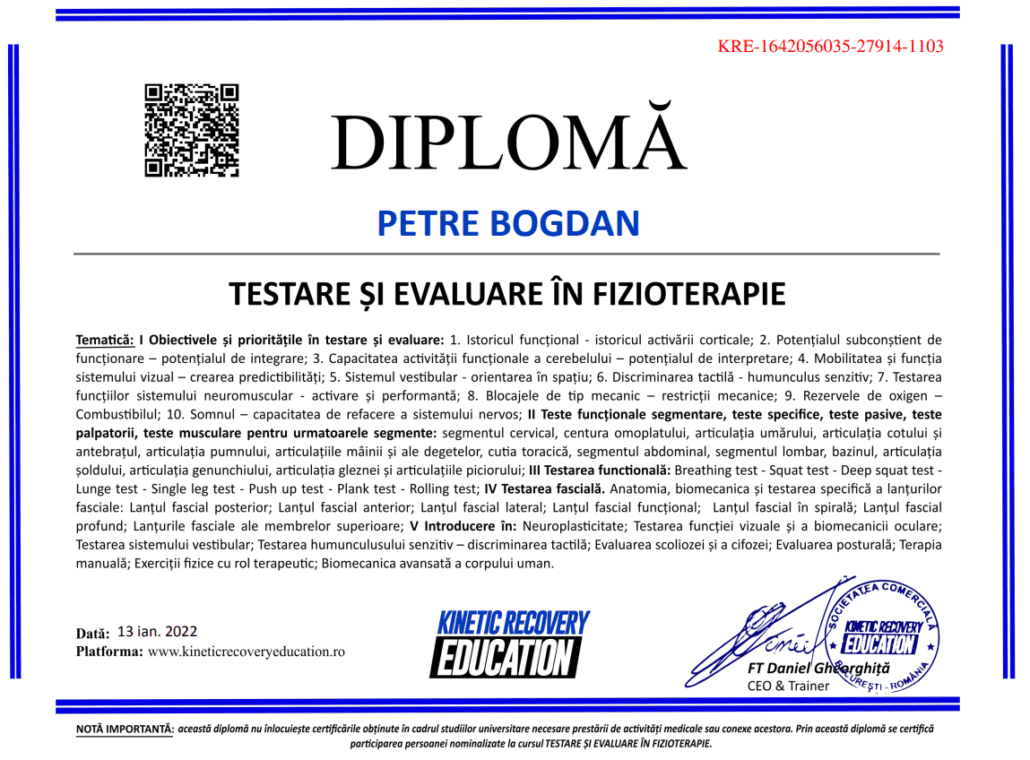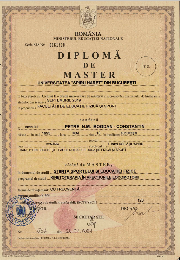 - 2017-2019 – Diploma de Master – Kinetoterapia în Afecțiunile Locomotorii, Facultatea de Educație Fizică și Sport, București