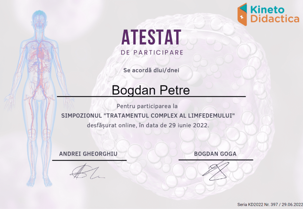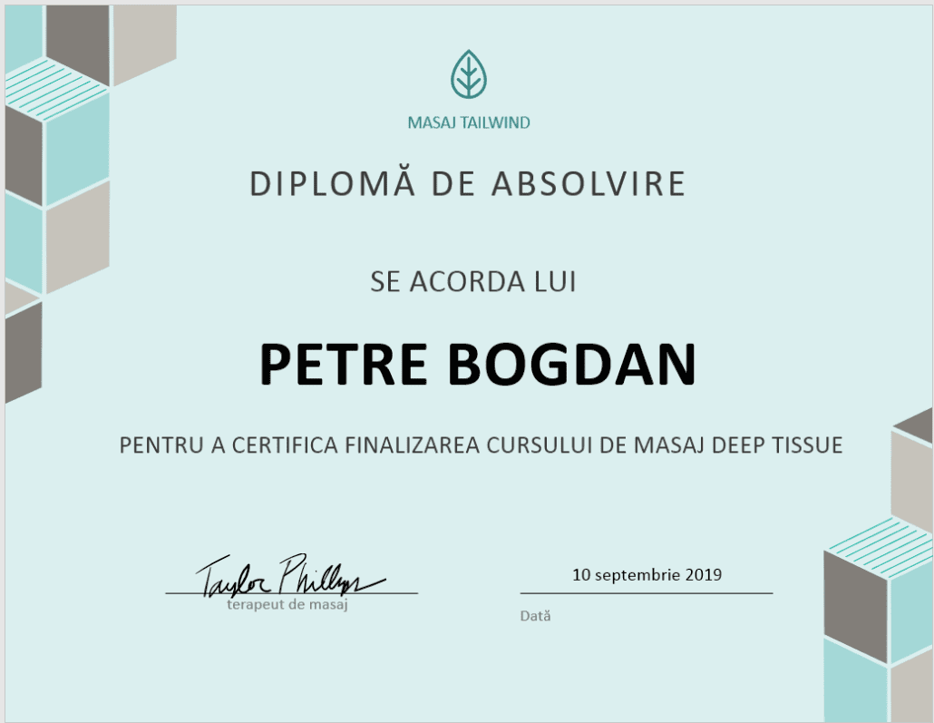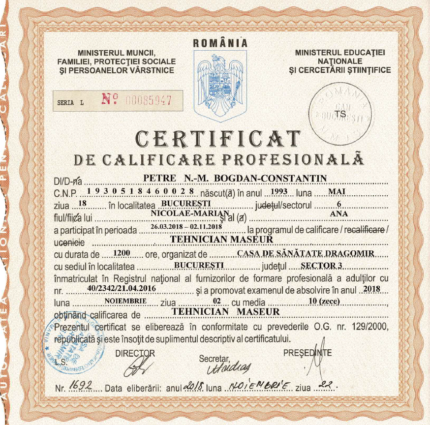 - 2018 – Diploma de Tehnician Maseur – Școala de Masaj Dragomir, București