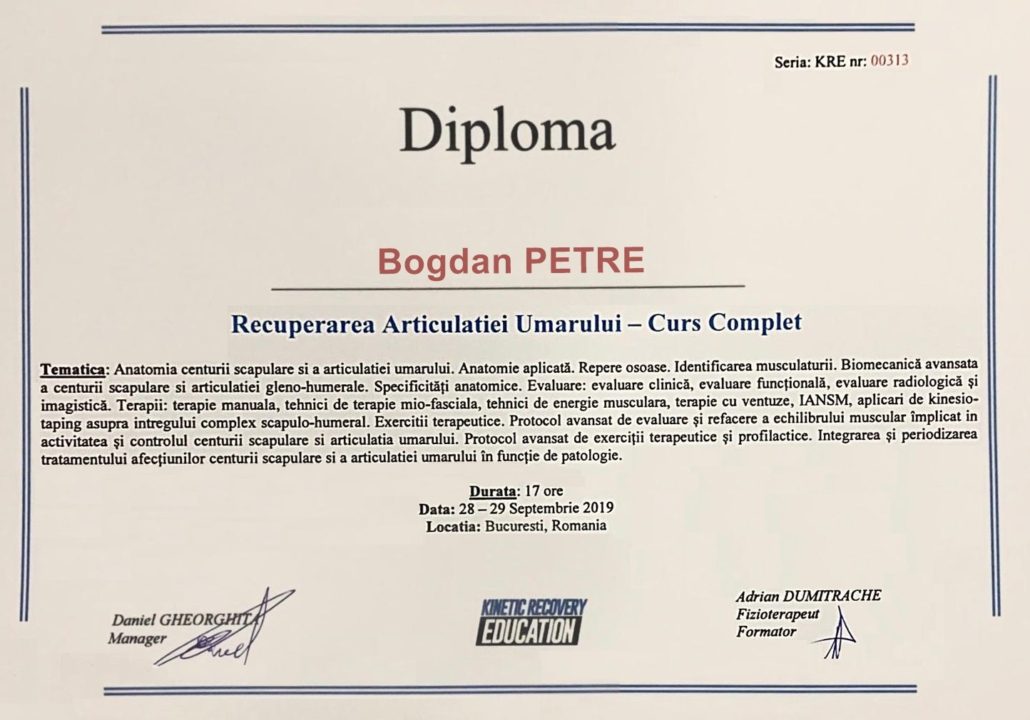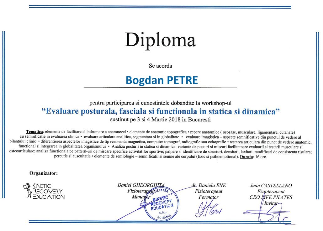 Numele meu este Petre Bogdan Constantin și mă pot prezenta ca fiind fiziokinetoterapeut. Sunt o fire ambițioasă și perfecționistă, fapt ce a dus la multe reușite. Cred că 80% din copii susțin că doresc să fie doctori atunci când sunt întrebați ce vor să devină când vor crește mari. La fel spuneam și eu, neștiind pe atunci că voi profesa în domeniul medicinei. Și totuși, de ce nu am ales să fiu medic?! Tocmai pentru că am considerat că nu este suficient să mă specializez pe un singur domeniu, ci să am prilejul de a recupera pacienți cu afecțiuni din toate categoriile.
