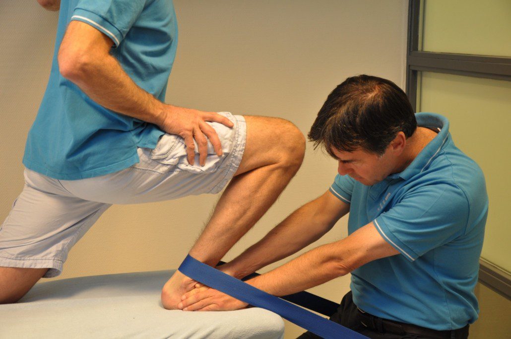 • În timp ce accesoriul (cureaua Mulligan) este menținut în tensiune, se solicită pacientului să execute mișcare din articulația mobilizată, în direcția restricționată, pentru a verifica dacă semnele inițiale s-au îmbunătățit. Scopul este de.a executa mișcări fără apariția durerilor din stadiul inițial.